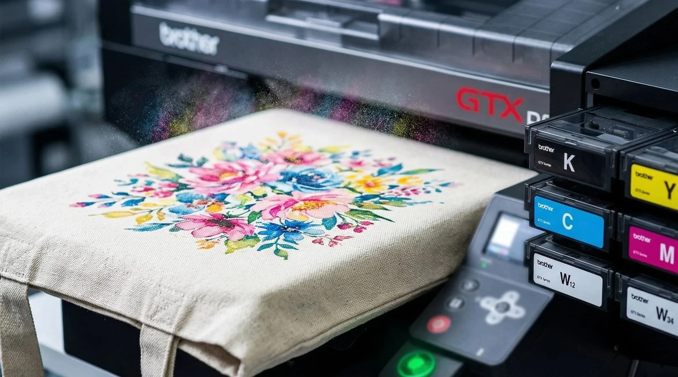 Máy in Brother GTXpro đang in phun hình ảnh sắc nét lên túi tote canvas thân thiện môi trường ngay tại điểm chạy sự kiện.